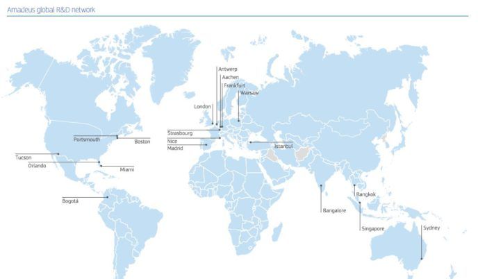 Wie die verschiedenen Karten im Amadeus Global Report 2015 zeigen, ist das F&E-Netzwerk ein weiteres Beispiel für die globale Präsenz von Amadeus. Nizza (Frankreich) ist das größte Zentrum für F&E-Aktivitäten mit Teams vor Ort und weltweit, die Lösungen für Reisevertrieb, E-Commerce, Reisebüros, Fluggesellschaften, Hotels, Bahngesellschaften, Flughafen-IT und Travel Intelligence entwickeln. Im Jahr 2015 wurden zwei F&E-Standorte in Singapur und Orlando (USA) eröffnet, nachdem die im Bereich Flughafen IT erworbenen Unternehmen integriert wurden.