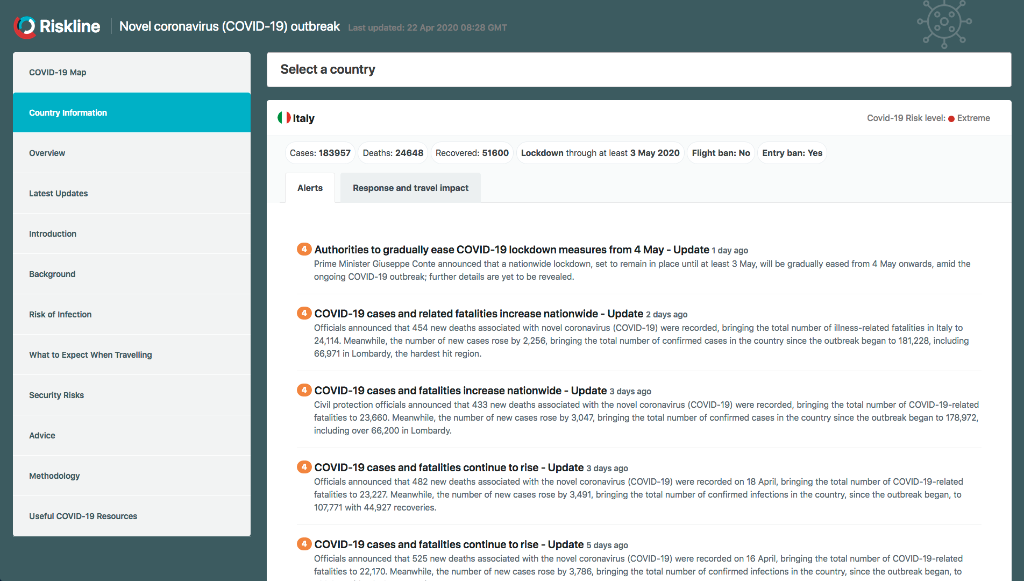 Seit Anfang des Jahres verfolgt Riskline* die Entwicklung des COVID-19-Ausbruchs genau und kommuniziert die Informationen in Echtzeit über Warnmeldungen, Reisehinweise, Sonderberichte und Informant-Artikel an seine Kunden und Partner.