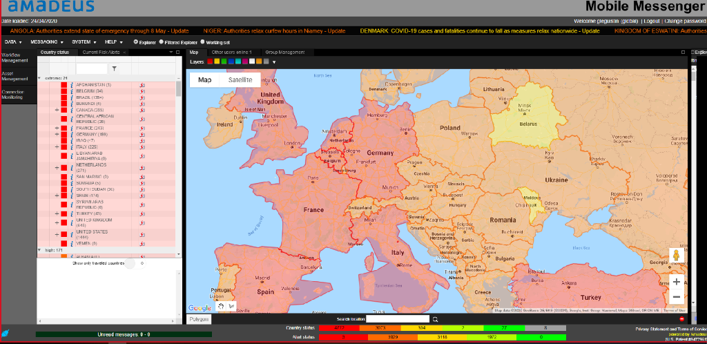 Damit Amadeus Unternehmenskunden, die den Amadeus Mobile Messenger nutzen, diese wichtigen Informationen erhalten, während wir alle durch COVID-19 navigieren, hat Amadeus Echtzeit-Statusanzeigen und Warnungen zu bestimmten Regionen und Ländern integriert, die gefährdet sind, eine Karte mit den Ausbreitungsorten des Virus, die neuesten Reisebeschränkungen, Informationen über das Schließen und Öffnen von Grenzen und vieles mehr.