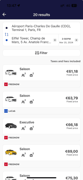 Karhoo wurde zunächstintegriert im Jahr 2022 in Cytric Mobil integriert, sodass Nutzer in mehr als 1.000 Städten auf der ganzen Welt vorgebuchte oder On-Demand-Fahrten anbieten können. Mit Hunderten von Flotten von Taxis und privaten Transferunternehmen wird den Nutzern eine große Auswahl an Fahrzeugen geboten, wobei ständig neue Städte und Ziele hinzugefügt werden, um der Nachfrage gerecht zu werden.