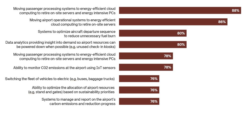 Fast die Hälfte der befragten Flughafenleiter gab an, dass die größte Chance für ihren Flughafen darin besteht, Airline-Partnern dabei zu helfen, ihren CO2-Fußabdruck zu verringern. Zu den Optionen gehören die Verbesserung der Abflugsequenzen des Flugzeugs, um den Treibstoffverbrauch am Boden zu reduzieren, und die Optimierung der Art und Weise, wie Gepäck in das Flugzeug geladen wird, um eine bessere Balance zu erreichen, was zu einem treibstoffeffizienteren Fliegen führt.