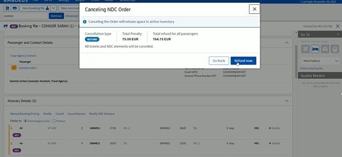 Ein Folgevorteil aus dem vorherigen Punkt ist mit der Tatsache verbunden, dass die Fluggesellschaften für alle Berechnungen in NDC verantwortlich sind: Es besteht kein Risiko, dass ein Reiseverkäufer eine Rückerstattung falsch berechnet und Strafen von einer Fluggesellschaft kassiert, wenn er nur den Knopf drücken muss. Amadeus hat Hunderttausende von NDC-Aufträgen bearbeitet, und wir haben bisher praktisch null ADMs aufgrund einer Fehlkalkulation des Reisebüros gesehen. Das bedeutet eine erhebliche Einsparung von Kosten und Bearbeitungszeit für Reiseverkäufer.