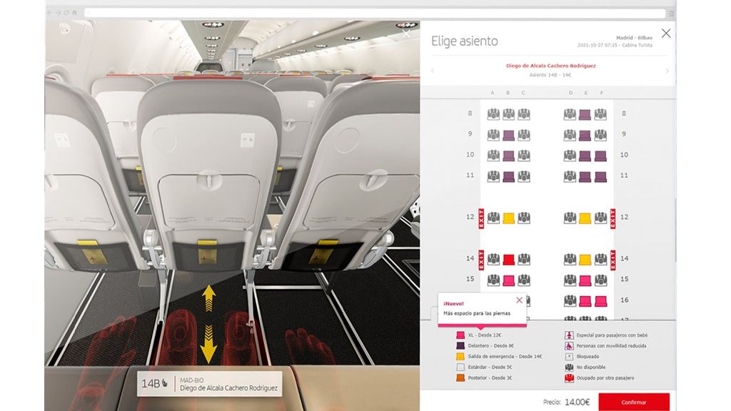 Immersive 3D-Visualisierung jedes ausgewählten Sitzplatzes während der Buchung, beim Check-in oder bei der Buchungsverwaltung, um den Verkauf von normalen Sitzplätzen, zusätzlicher Beinfreiheit, Sitzplätzen in den Reihen am Ausgang oder Upgrades zu steigern.