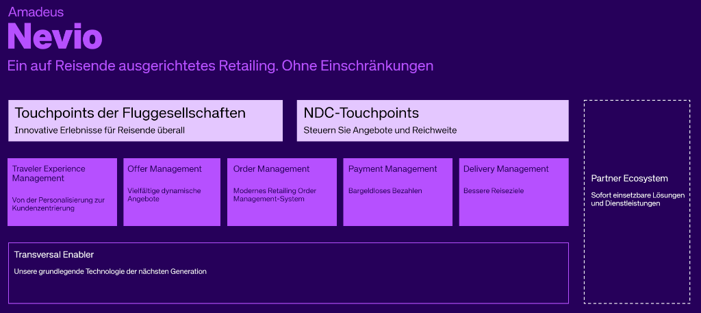Amadeus Nevio nutzt modulare, offene KI‑Technologie. Es bietet End‑to‑End‑Lösungen, die über Offer und Order hinausgehen. Sichern Sie sich Agilität und Sicherheit, um Ihr Unternehmen von der Inspiration bis nach der Reise zu transformieren.