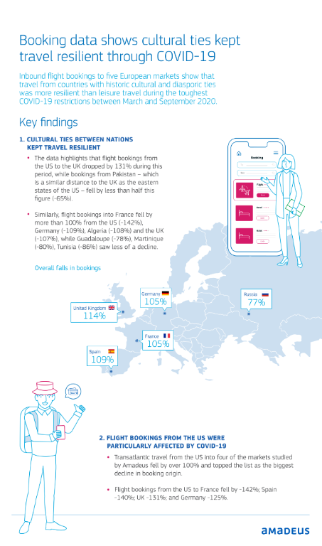 While air traffic worldwide has seen dramatic falls due to the global COVID-19 pandemic, data compiled by Amadeus shows that flight bookings to five leading European nations from countries with close historic, cultural and diasporic ties have been more resilient.