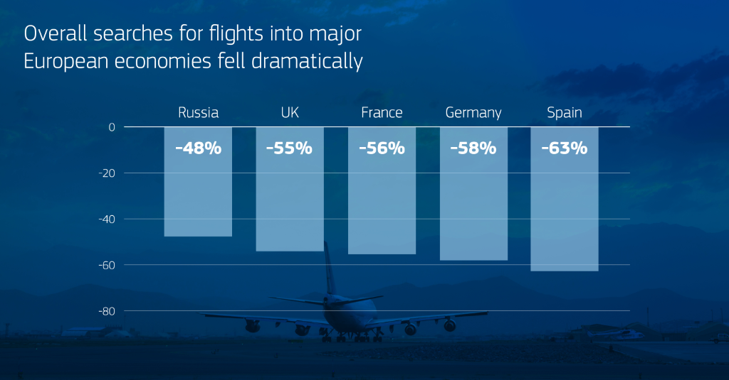 Transatlantic travel into the UK, France, Germany and Spain from the US were particularly affected. The biggest decline of key market inbound travel was from Australia to the UK, where booking traffic dropped by 165%. This was likely due to strict lockdowns and border closures.
