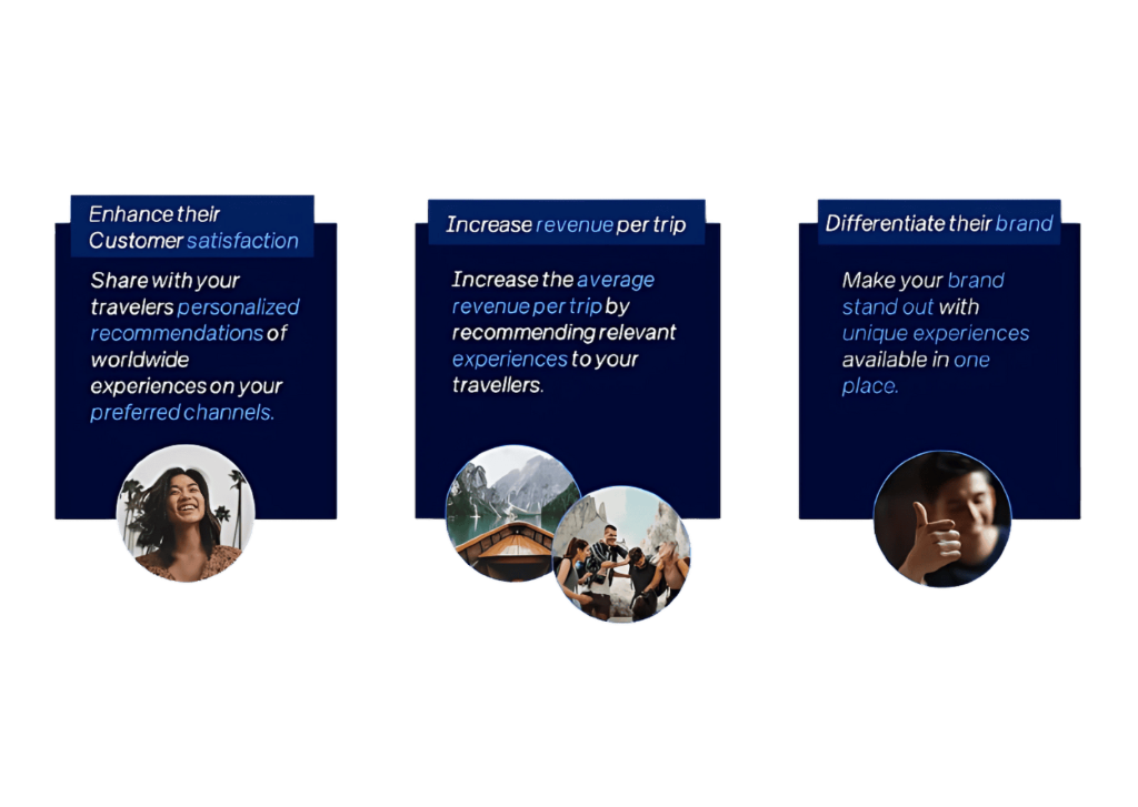 Aumenta la satisfacción del cliente recomendando experiencias personalizadas basadas en el perfil y el contexto del viaje. Utiliza el contenido de la experiencia para inspirar a los clientes a viajar y deleitarlos con actividades de ventas cruzadas una vez reservado su viaje. Todo esto, mientras obtienes ingresos adicionales y diferencias tu marca.
