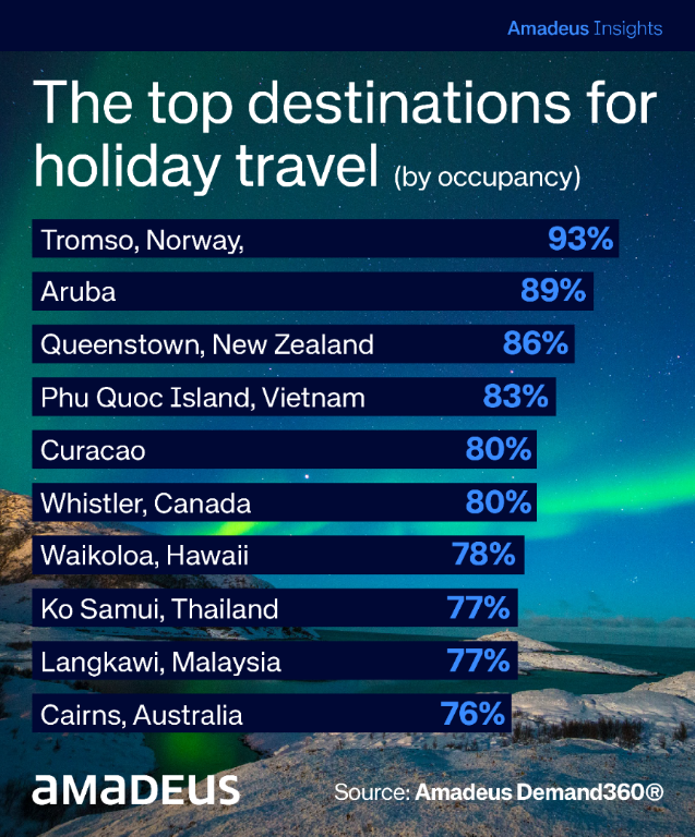 Los hoteleros se están preparando para recibir a una gran cantidad de viajeros que buscan escapadas a la nieve en estas fiestas, aunque para algunos los destinos de playa siguen estando en su itinerario.Los nuevos datos prospectivos de Amadeus revelan qué destinos encabezan actualmente las listas de ocupación hotelera durante Navidad y Año Nuevo.
